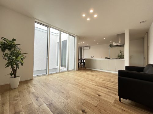 ②23帖のLDKと大開口の窓が外観からは想像できない開放感を実現。中庭には目隠しフェンスを設置しており、外からの視線が気にならず、リビングはお昼でもカーテンいらず。
