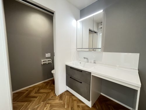 ④洗面所からトイレ、脱衣室、ファミリークローゼットへ繋がる動線で日々の家事のストレスを最小限に。