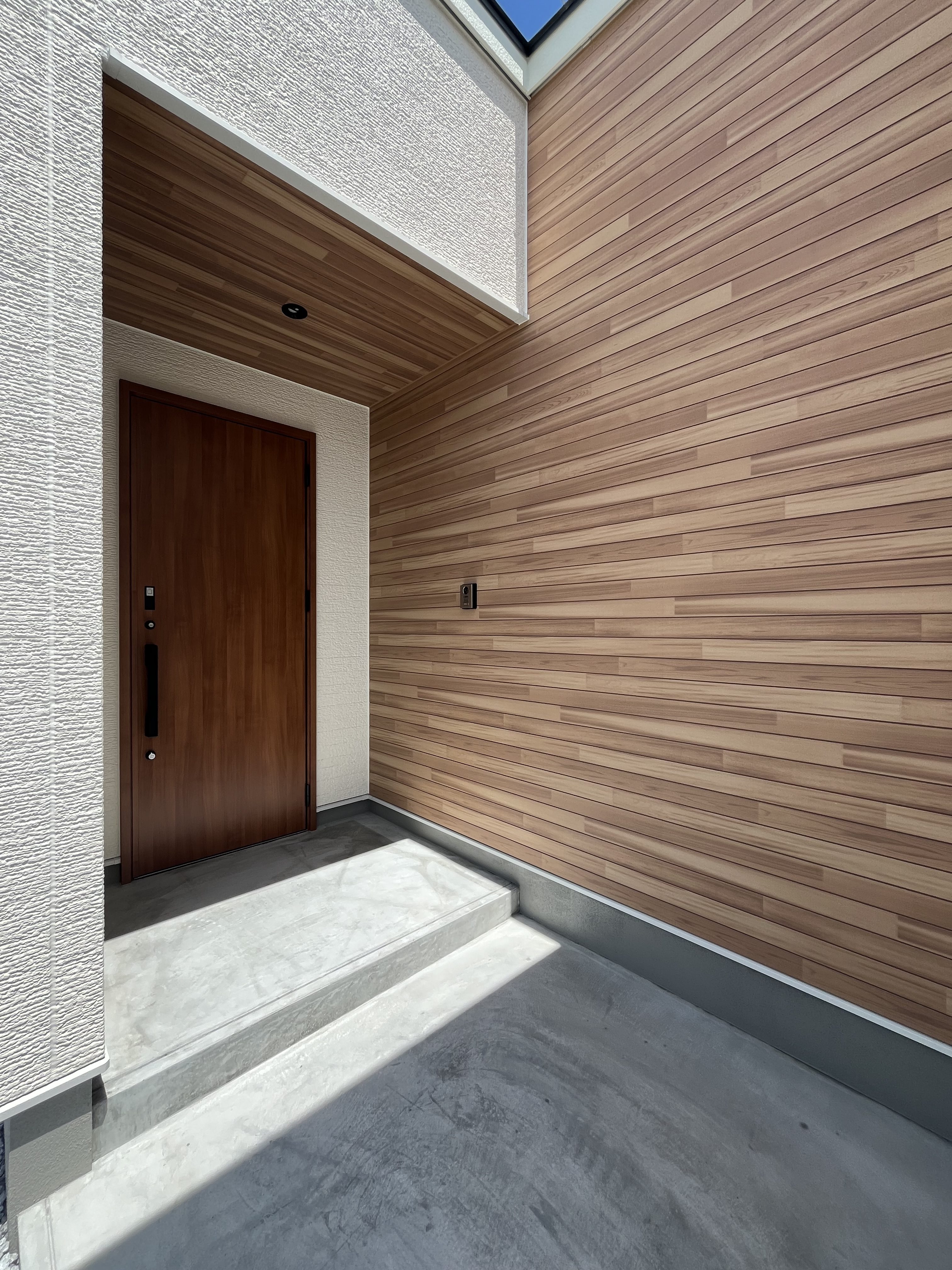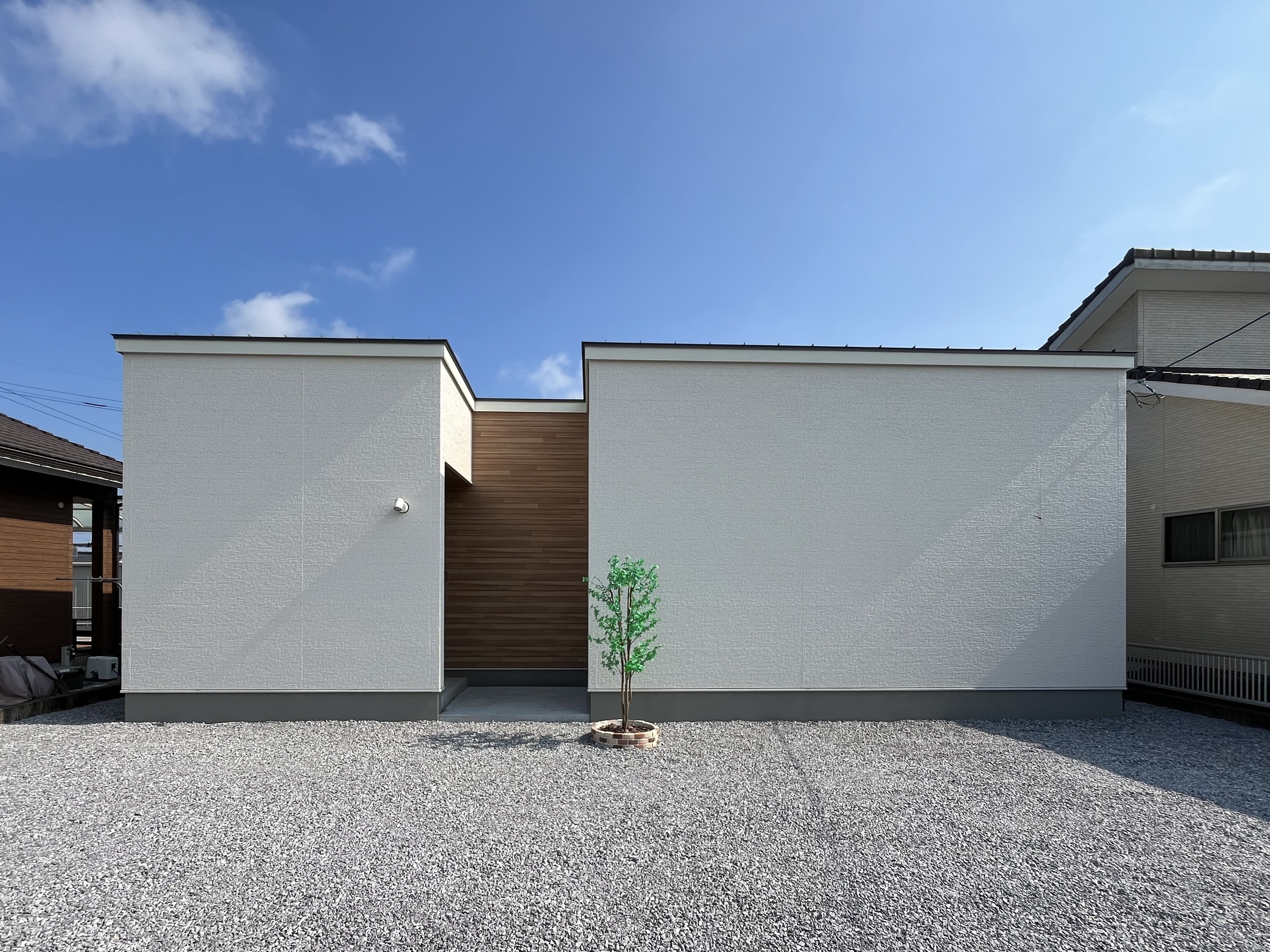 ①外観は白と木目を基調としたシンプルな見た目に。道路側に窓が無い為、防犯性にも優れた設計となっている。