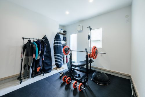 ①玄関横の土間スペースには、アウトドア用品に加えトレーニングマシンも設置。庭から直接出入りできる為、BBQ用品の収納など使い勝手の良い空間として活躍。