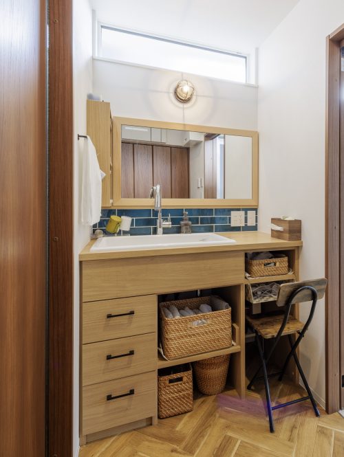 ④ブルーのタイルを貼った造作の洗面化粧台。高窓から光が差し込み、明るいリゾートのイメージ。