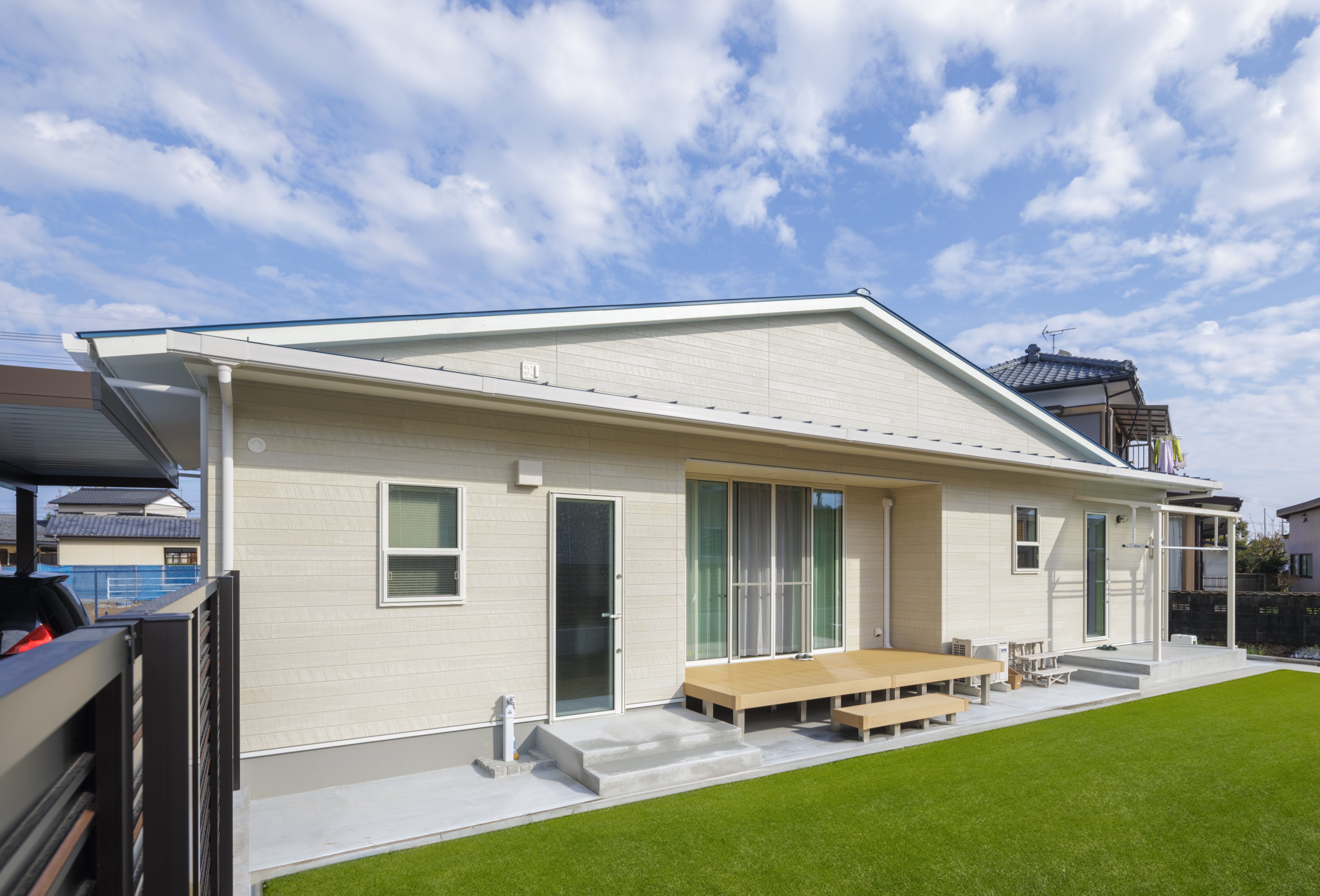 ②白を基調とした壁に一部天井を高くし、明るく開放感あふれるリビング。家の中心に配置した対面キッチンからは玄関・リビング・和室を見渡せる。デッキの向こうの広い芝に南国のイメージの室内が調和して更に癒しの空間をつくり出している。